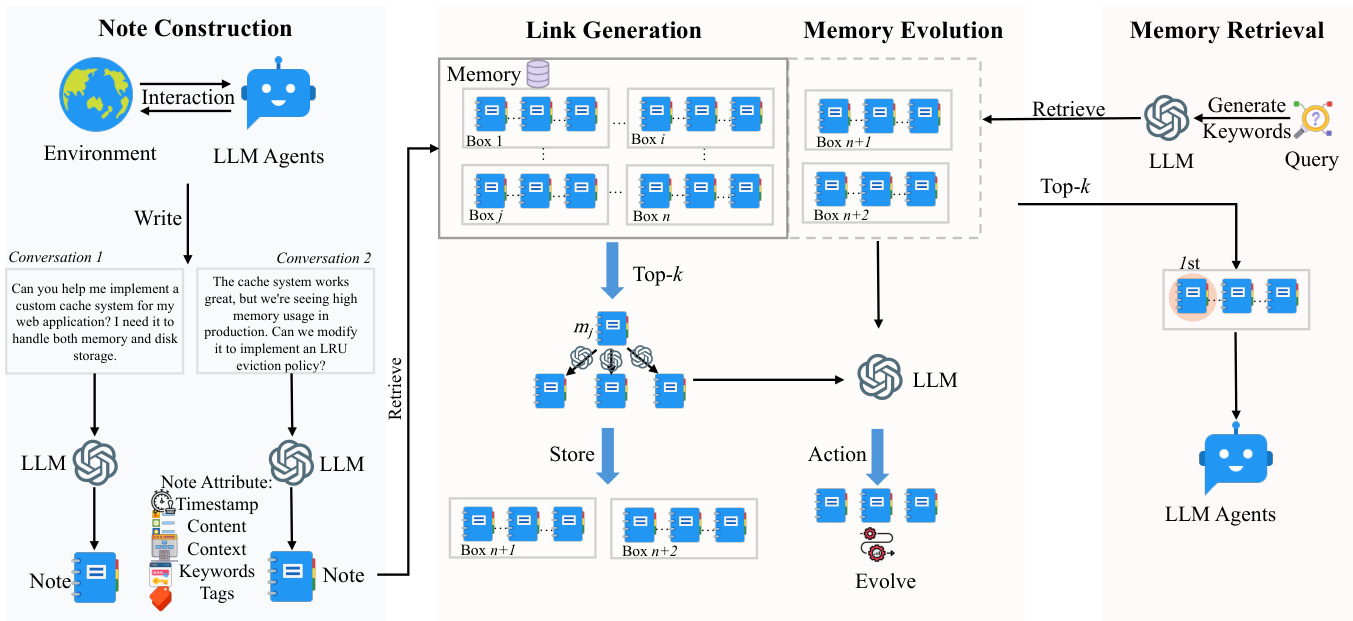 我们提出了 A-MEM,一种为大语言模型(LLM)智能体设计的记忆系统,能够自主生成上下文描述、动态建立记忆连接,并根据新经验智能演化现有记忆。该系统使大语言模型智能体具备长期交互能力,而无需预先设定记忆操作。