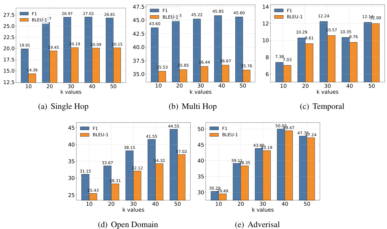 We conducted extensive experiments to analyze the impact of the memory retrieval parameter $\mathrm{k\Omega}$ , which controls the number of relevant memories retrieved for each interaction. As shown in Figure 3, we evaluated performance across different k values (10, 20, 30, 40, 50) on five categories of tasks using GPT-4-mini as our base model. The results reveal an interesting pattern: while increasing $\mathrm{k\Omega}$ generally leads to improved performance, this improvement gradually plateaus and sometimes slightly decreases at higher values. This trend is particularly evident in Multi Hop and Open Domain tasks. The observation suggests a delicate balance in memory retrieval - while larger k values provide richer historical context for reasoning, they may also introduce noise and challenge the model’s capacity to process longer sequences effectively. Our analysis indicates that moderate $\mathbf{k}$ values strike an optimal balance between context richness and information processing efficiency.