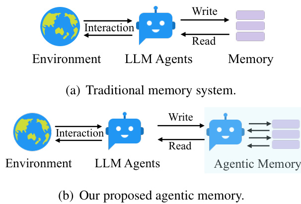 大语言模型 (LLM) 智能体在各种任务中展示了卓越的能力,最近的进展使其能够与环境互动、执行任务并自主做出决策 (Mei et al., 2024; Wang et al., 2024; Deng et al., 2023)。它们将大语言模型与外部工具和精细的工作流程相结合,以提高推理和规划能力。尽管大语言模型智能体具备强大的推理性能,它仍需要一个记忆系统来提供与外部环境的长期互动能力 (Weng, 2023)。