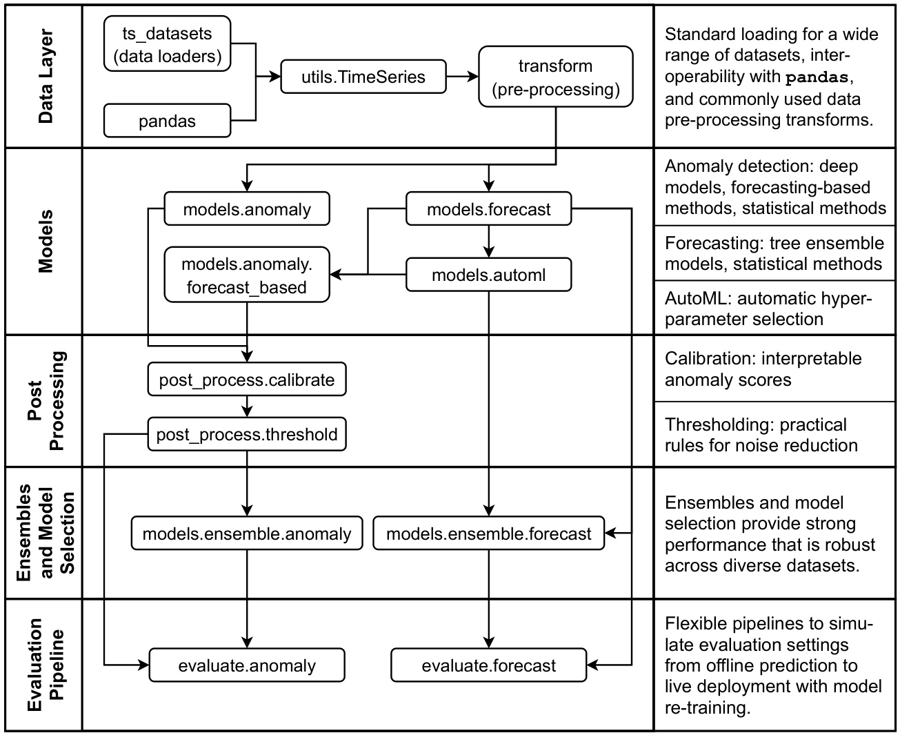 At a high level, Merlion’s module architecture is split into five layers: the data layer loads raw data, converts it to Merlion’s TimeSeries data structure, and performs any desired pre-processing; the modeling layer supports a wide array of models for both forecasting and anomaly detection, including autoML for automated hyper parameter tuning; the postprocessing layer provides practical solutions to improve the inter pet ability and reduce the false positive rate of anomaly detection models; the next ensemble layer supports transparent model combination and model selection; and the final evaluation layer implements relevant evaluation metrics and pipelines that simulate the live deployment of a model in production. Figure 1 provides a visual overview of the relationships between these modules.