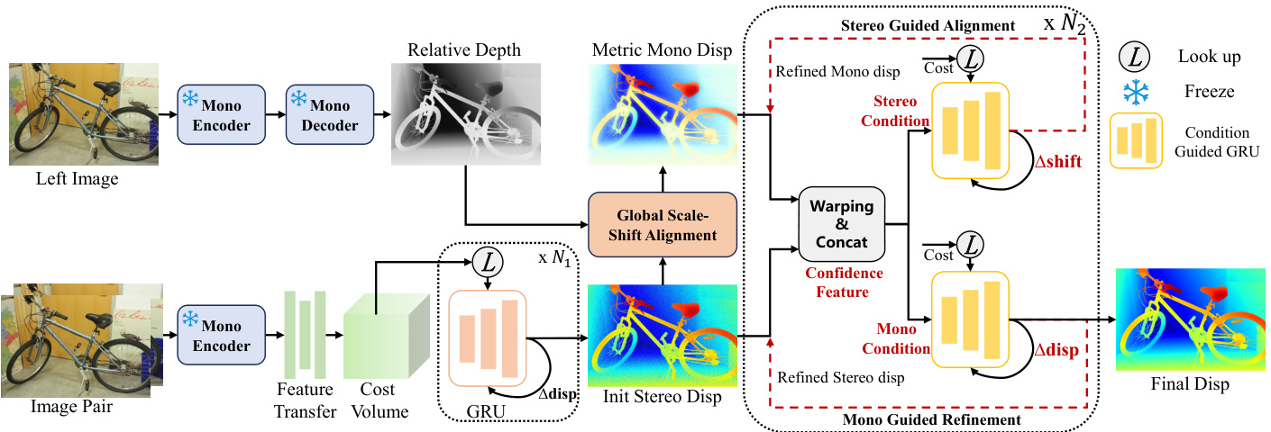 Once the initial (relative) monocular depth and stereo disparity are obtained, they are fed into the mutual refinement module to iterative ly refine each other. We first perform global scale-shift alignment, which converts monocular depth into a disparity map and aligns it coarsely with stereo outputs. Then we iterative ly perform a dual-branched refinement: Stereo guided alignment (SGA) leverages stereo cues to update the per-pixel shift of the monocular dispar- ity; Mono guided refinement (MGR) leverages the aligned monocular prior to further refine stereo disparity.