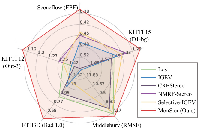 | Method | GwcNet[14] | LEAStereo[8] | ACVNet[37] | IGEV[38] | Selective-IGEV[35] | MonSter (Ours) |