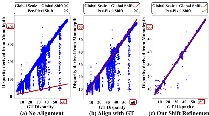 Figure 3. Distance between GT disparity and the disparity derived from monocular depth [46] on KITTI dataset. The red line indicates identical disparity maps. (a): Without any alignment. (b) Align depth with GT using global scale and global shift values (same for all pixels). (c) The monocular disparity produced by MonSter, with per-pixel shift refinement. Even globally aligned with GT, SOTA monocular depth models still exhibit severe noise. Our method MonSter effectively addresses this issue by refining monocular depth with per-pixel shift, which fully unlocks the power of monocular depth priors for stereo matching.