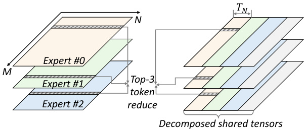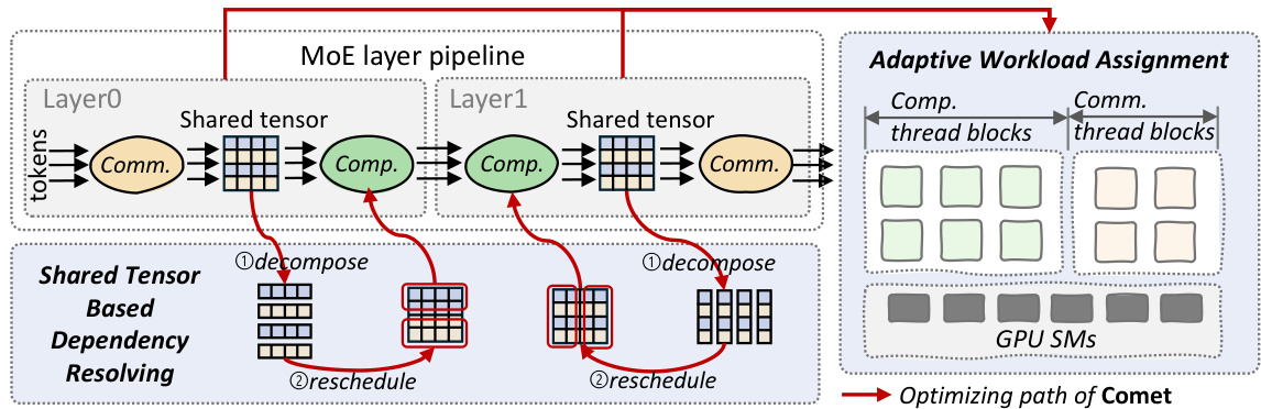 As shown in Figure 3, Comet first leverages the shared tensor based dependency resolving method to optimize the pipelines in the MoE structure by decomposing and rescheduling the shared tensors. According to the reformed pipelines, Comet then provides highly-efficient fused kernels through the adaptive workload assignment mechanism.