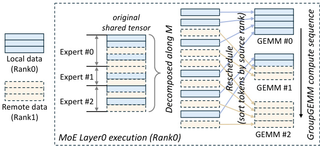 图 5: 在 MoE 层 0 中分解并重新调度共享张量。在本示例中,三个专家位于 Rank 0 上,每个专家都需要本地和远程数据进行计算。