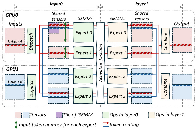 Another characteristic of MoE is the dynamic routing of tokens to different experts, resulting in varying input shapes for experts at runtime (e.g., the token number received by Expert0 and Expert1 are different as shown in Figure 2). This variability imposes differing communication and computation demands on GPUs. Besides, the hardware environments can also have various compute architectures or network topologies, providing different compute capacities and communication bandwidths. Achieving seamless overlap between computation and communication thus requires dynamically adjusting the allocation of GPU resources to different workloads, which is hard to be realized through wrapping workloads into separate kernels.