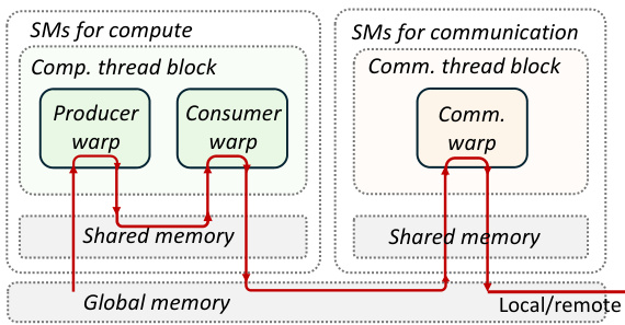 Hardware resource restriction. The proposed thread block-specialized kernel is designed with the primary objective of minimizing data movement costs. However, this design must also contend with hardware resource limitations. For instance, it is theoretically feasible to integrate communication warps with computation warps within the same thread block to eliminate redundant global memory accesses. However, the thread number restriction of warps constrict the communication operator to fully utilize the communication bandwidth. From another perspective, the warps for communication also interfere with the computation warps within the same thread block.