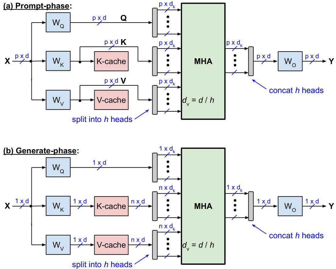 • During the prompt-phase (aka prefill phase), all $p$ input-tokens are batched up and processed in parallel. In this phase, the $\mathrm{K}$ and $\mathrm{v}$ projections are stored in the KV-cache. • During the generate-phase (aka decoding phase), each output-token is generated sequentially (aka autoregressively). For each iteration of the generate-phase, only one new $\mathbf{K}$ -vector and one new V-vector are calculated and stored in the KV-cache, while all the previously stored KV-vectors are read from the cache.