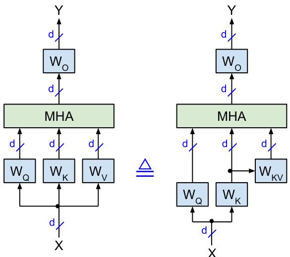 Figure 1: Mathematically identical implementations of multi-headed self-attention with square weight matrices  $\in\mathbb{R}^{d\times d}$  . Left: vanilla version. Right: proposed version where values  $\mathrm{v}$   are computed from keys K with  $\bar{W_{K V}}=W_{K}^{-1}W_{V}$  . The  $\triangleq$  symbol denotes mathematical identity.