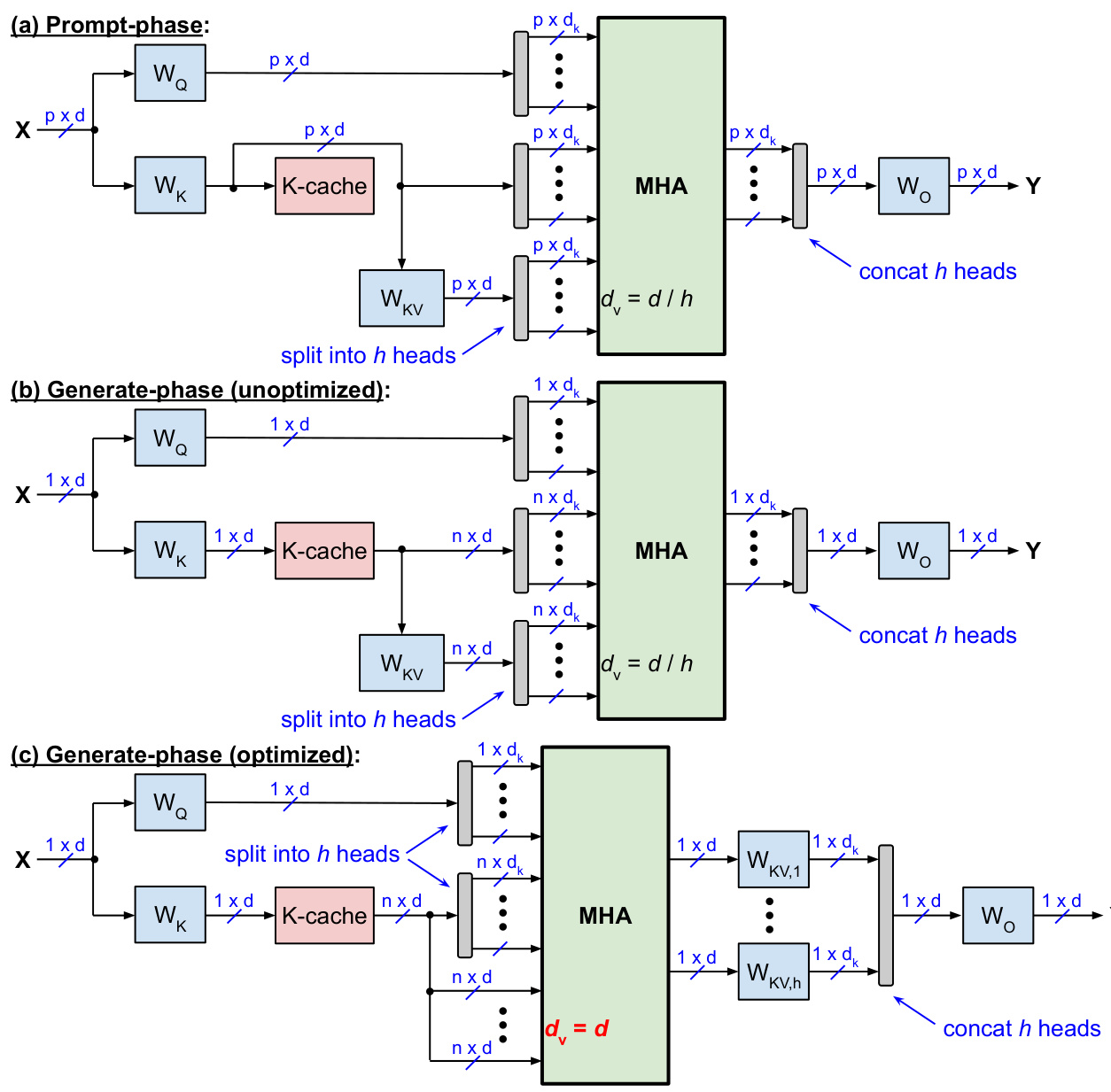 Figure 2: Standard MHA with KV-cache during (a) prompt-phase and (b) generate-phase.