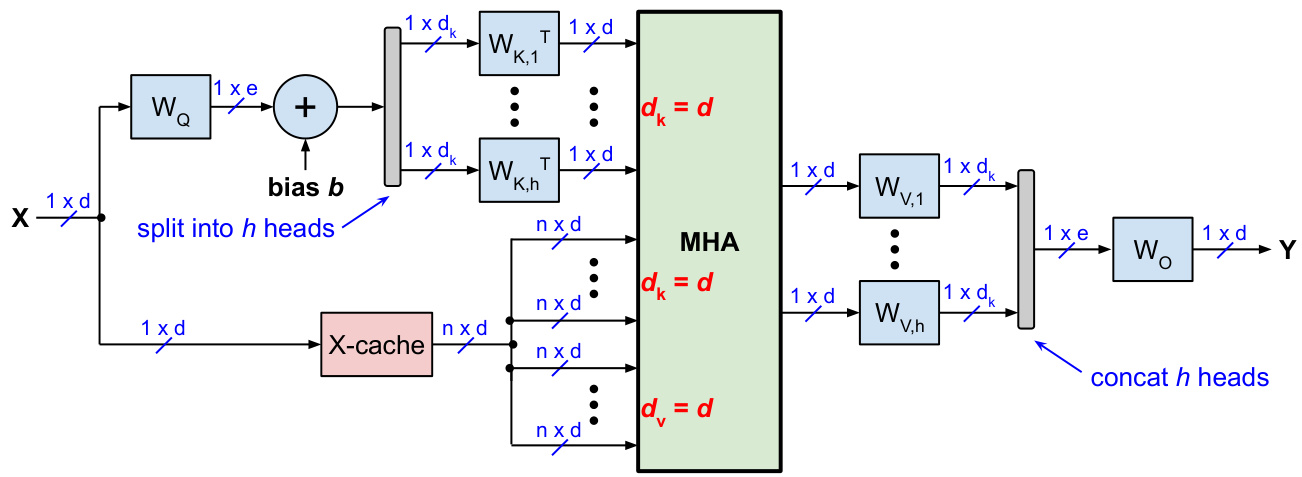 with $W_{Q}=\operatorname{concat}(W_{Q,1},\ldots,W_{Q,h})$ , $W_{K}=\operatorname{concat}(W_{K,1},\ldots,W_{K,h})$ , and $W_{V}=\operatorname{concat}(W_{V,1},\ldots,W_{V,h})$ , and without the causal mask for simplicity. The matrices $Q,K,V,W_{Q},W_{I}$ , and $W_{V}$ are split into $h$ sub matrices, one for each attention-head. Input $X$ , output $Y$ , queries $Q$ , keys $K$ , and values $V$ are $\in\mathbb{R}^{n\times d}$ , where $n$ is the current sequence length (in tokens) and $d=d_{\mathrm{model}}$ is the dimension of the embeddings.