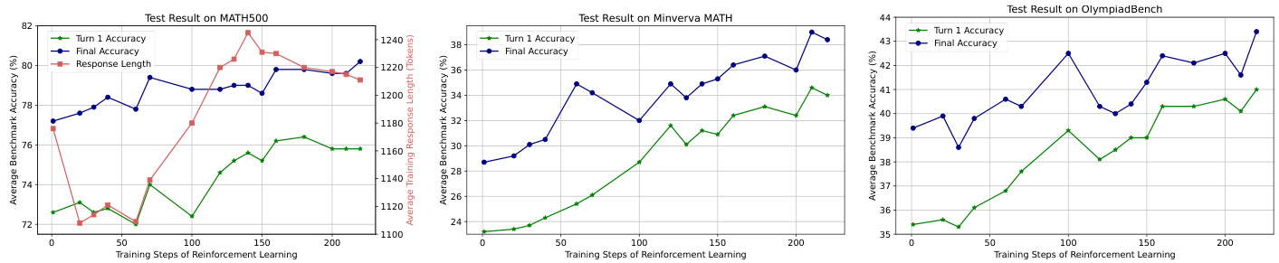 Learning dynamic of the RL stage. While the RL training improves final accuracy, the final test accuracy is determined by both the turn-1 accuracy and $\Delta(t_{1},t_{2})$ . In particular, we notice that the final accuracy gains come primarily from the higher turn-1 accuracy, as the models after the RL training usually admit a much higher turn-1 accuracy, but also a lower $\Delta^{i\rightarrow c}(t_{1},t_{2})$ . To understand the learning dynamic of the RL training, we plot test accuracy on three benchmarks in terms of the RL training steps in Figure 1. We observe that in the early stage of the RL training, both the turn-1 accuracy and the final accuracy increase, and their gap $\Delta(t_{1},t_{2})$ is also increased or maintained as a stable level. This indicates that the models learn to use their knowledge better in the first round and improve or maintain a comparable level of correction ability. Around training step 100, however, the increase of the final accuracy is mainly from the higher turn-1 accuracy and their gap is narrowed, indicating less reliance on self-correction.