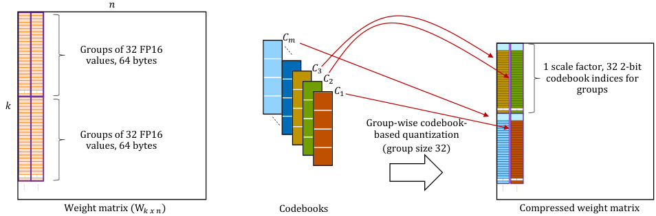 Uniform quantization divides the range of weight values into equal intervals and assigns a quantization level to each interval. It distributes quantized values uniformly and equidistant ly. As a result, despite being commonly used in conjunction with group-wise quantization for LLMs, it is not very flexible in matching the non-uniform patterns typically found in LLM weight distributions [16], resulting in suboptimal accuracy, especially for low-precision LLM quantization. Non-uniform quantization with a codebook allows for a more flexible allocation of high-precision weight values. Given a weight distribution, non-uniform codebook-based quantization can identify $k$ centroids that best represent the weight values and map weights to them. For example, when quantizing a weight distribution to 4-bits, state-of-the-art codebook-based quantization techniques aim to determine the 16 centroid values that best represent the values. Each high-precision weight can then be represented by the 4-bit index of a centroid in the codebook instead of its original bit-width. In addition, non-uniform codebook-based quantization requires storing the codebook itself and incurring associative overhead. While there are a few recent non-uniform codebook-based quantization techniques for LLMs in the literature [16, 29, 2, 28], they either do not exhibit good runtime for both phases (prompt processing and auto regressive decoding) of LLM inference under ultra-low-bit precision scenarios or do not extend well to achieving extreme degrees of compression, as discussed below.