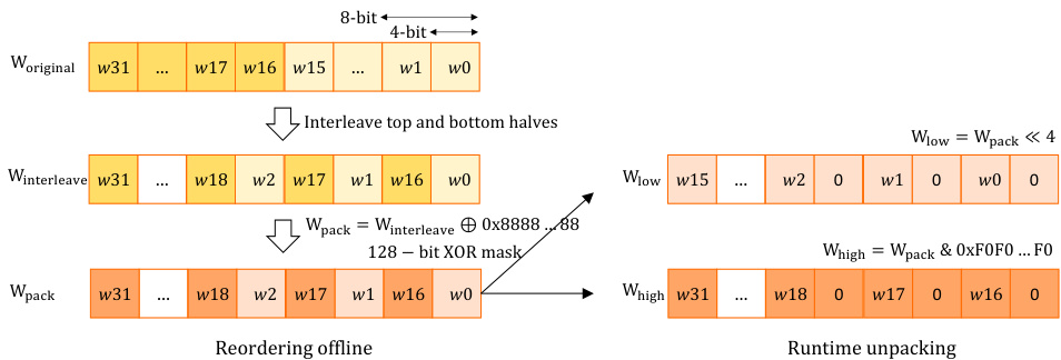 For 4-bit group quantization formats, typically the top and bottom halves of the 4-bit weights of a group are interleaved in memory. For a group size of 32, the 4-bit weights $w_{0},w_{1},w_{2},w_{3},...,w_{31}$ are reordered into $w_{0}$ , $w_{16}$ , $w_{1}$ , $w_{17}$ , ..., $w_{15}$ , $w_{31}$ sequence and stored in 16 bytes. Furthermore, to avoid sign extension issues, signed 4-bit values are stored as unsigned after adding an 8-bit bias value [20]. The same ordering within each group is preserved when group-quantized weights from multiple channels are interleaved to match the compute order, as described in the previous section. This weight packing format was specifically chosen to efficiently unpack them into unsigned 8-bit values using a few SIMD operations (bitwise AND and shift operations), and then subtract 8 to restore true signed values and sign bits of the 4-bit nibbles during the de quantization path. Although simple, this method adds a significant overhead to the de quantization process.