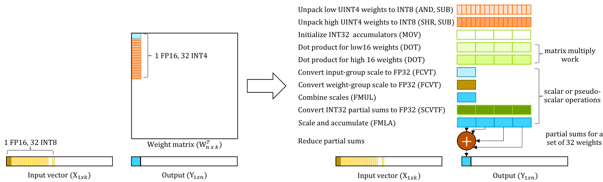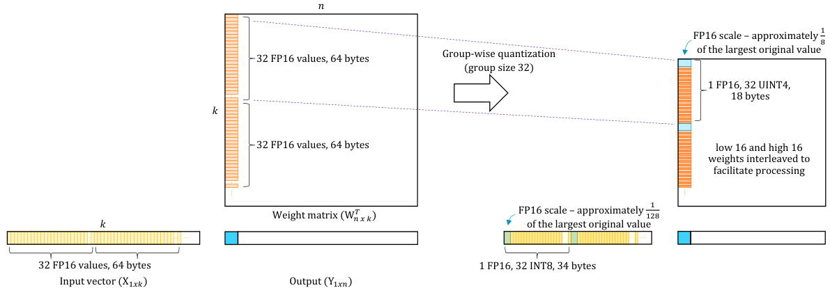 Motivation. Because the weights are in a 4-bit group-quantized format, a matrix-multiply kernel involving group-quantized 4-bit weights must incur an overhead when de quant i zing them, as shown in Figure 2. In particular, they need to be first unpacked and expanded from 4-bit weights to signed 8-bit values before computing dot-products between 8-bit integer weights and activation s. Aside from that, the FP16 scale factors of weights and activation s for a group must be expanded to FP32 values before being combined and used to scale a group’s integer dot product result (INT32 partial sum), as well as contributing to the final FP32 dot product value for a weight column. This process is repeated until the scaled dot product results of all quantized groups in an entire weight column are combined to obtain the weight column’s final dot product value against an activation row.