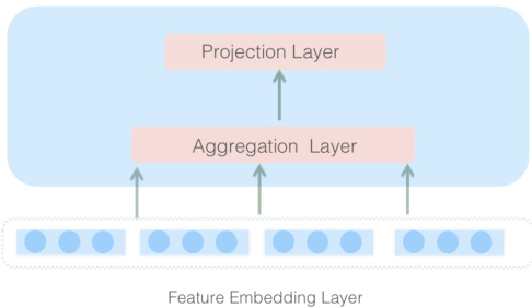 Factorization-Machine Supported Neural Networks (FNN)[24] is a feed-forward neural network using FM to pre-train the embedding layer. Wide & Deep Learning[22] jointly trains wide linear models and deep neural networks to combine the benefits of memorization and generalization for recommend er systems. However, expertise feature engineering is still needed on the input to the wide part of Wide & Deep model. To alleviate manual efforts in feature engineering, DeepFM[6] replaces the wide part of Wide & Deep model with FM and shares the feature embedding between the FM and deep component.