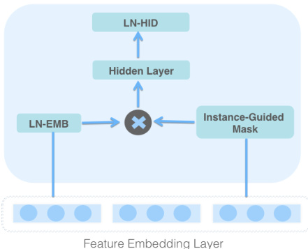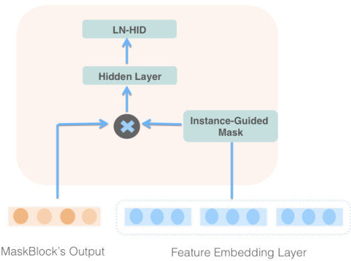 To overcome the problem of the inefficiency of feed-forward layer to capture complex feature interaction in DNN models, we propose a basic building block named MaskBlock for DNN ranking systems in this work, as shown in Figure 2 and Figure 3. The proposed MaskBlock consists of three key components: layer normalization module ,instance-guided mask, and a feed-forward hidden layer. The layer normalization can ease optimization of the network. The instance-guided mask introduces multiplicative interactions for feed-forward layer of a standard DNN model and feed-forward hidden layer aggregate the masked information in order to better capture the important feature interactions. In this way, we turn the widely used feed-forward layer of a standard DNN model into a mixture of addictive and multiplicative feature interactions.