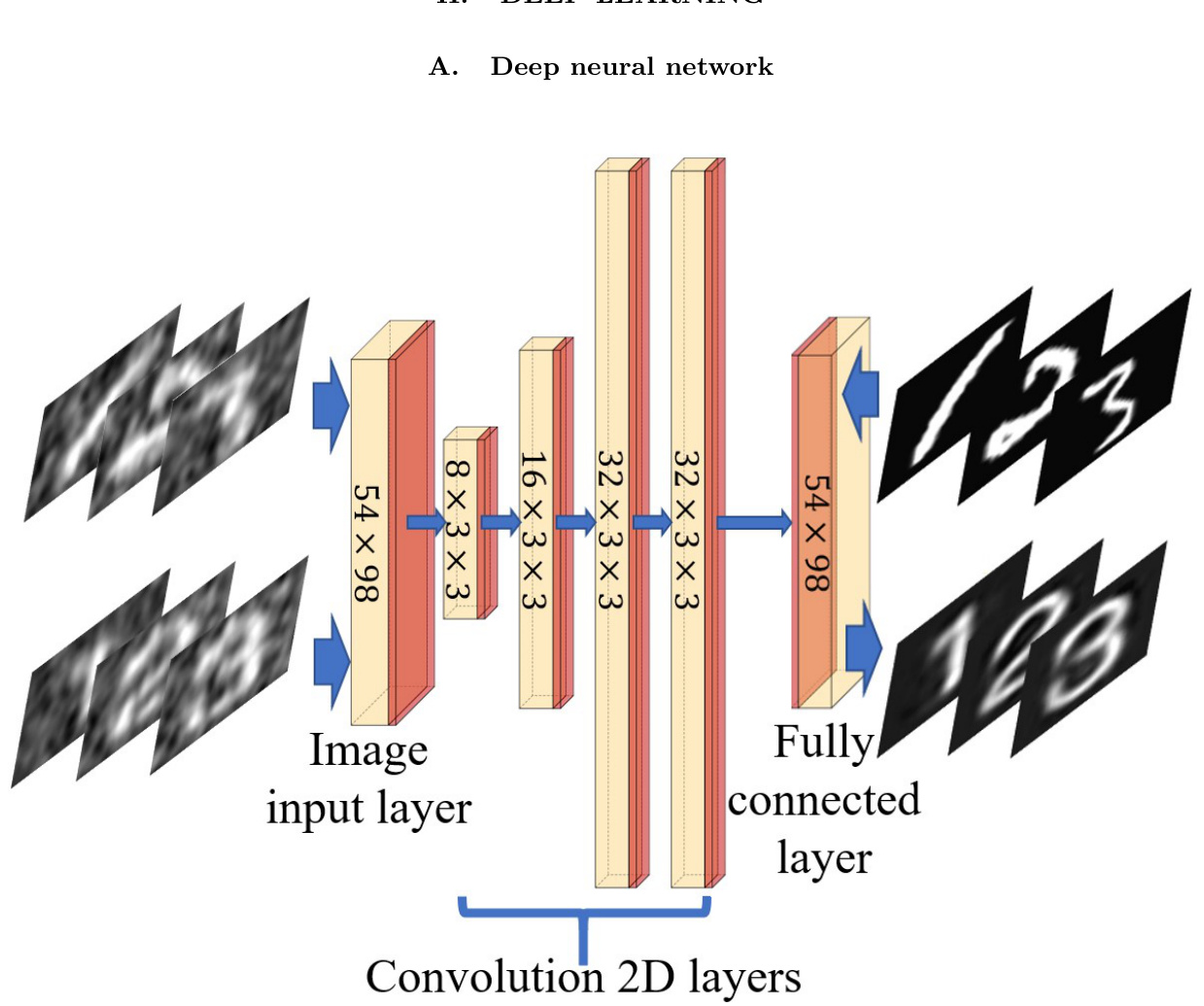 Our DNN model, as shown in Fig. 1, uses four convolution layers, one image input layer, and one fully connected layer. Small $3\times3$ receptive fields are applied throughout the whole convolution layers for better performance [39]. Batch normalization layers (BNL), rectified Linear Unit (ReLU) layers and zero padding are added between each convolution layer. The BNL is functioned to avoid internal covariate shift during the training process and speed up the training of DNN [40]. The ReLU layer applies a threshold operation to each element of the inputs [41]. The zero padding part was designed to maintain the characteristic of input images’ boundaries. To customize the size of training pictures, both the input and output layers are set to be $54\times98$ . The solver for training is employed by the Stochastic Gradient Descent with Momentum Optimizer (SGDMO) to reduce the oscillation via using momentum. The parameter vector can be updated via equation Eq. (1), which demonstrates the updating process during the iteration.