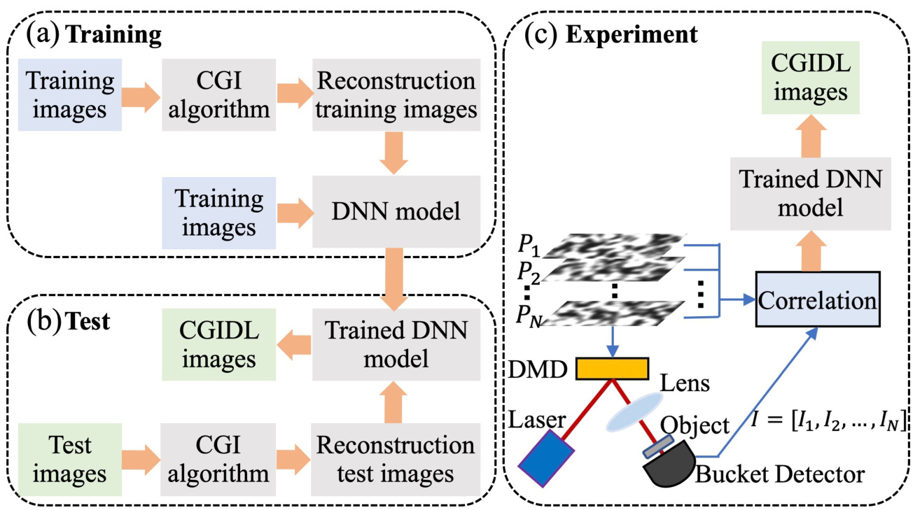 The trained DNN is then tested by simulation and used for retrieving CGI results in the experiments. In the testing part, the CGI algorithm generates reconstructed images from testing images with both the MNIST handwritten digits and block style digits, where the later set is different from images in the training group. As shown in Fig. 2(b), the trained DNN, fed with reconstruction testing images, generates CGIDL results. Comparing the difference between CGIDL and testing images, we could measure the quality of the trained DNN. Well-performed DNN can be used for retrieving CGI in the experiment.
