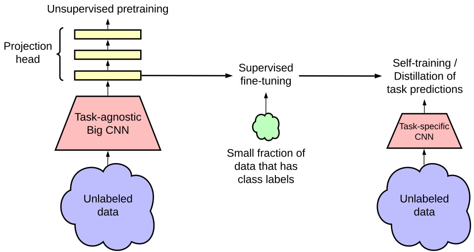 图 3: 提出的半监督学习框架通过两种方式利用未标注数据: (1) 在无监督预训练中任务无关的使用, (2) 在自训练/蒸馏中任务特定的使用。