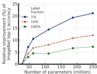 受视觉表征自监督学习最新进展的启发[16–20, 1],本文首先系统研究了ImageNet[21]半监督学习中"无监督预训练、有监督微调"范式。在自监督预训练阶段,图像数据以任务无关的方式使用(无需类别标签),因此学习到的表征并非直接针对特定分类任务进行优化。通过这种任务无关的无标签数据利用方式,我们发现网络规模至关重要:采用大型(深层且宽)神经网络进行自监督预训练和微调能显著提升准确率。除网络规模外,我们还总结出对比表征学习中若干关键设计要素,这些要素对后续有监督微调和半监督学习具有显著增益。