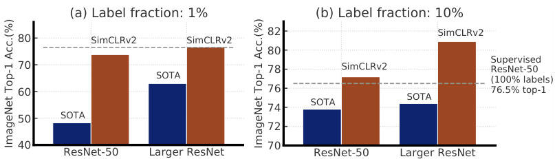 We combine these findings to achieve a new state-of-the-art in semi-supervised learning on ImageNet as summarized in Figure 2. Under the linear evaluation protocol, SimCLRv2 achieves $79.8%$ top-1 accuracy, a $4.3%$ relative improvement over the previous state-of-the-art [1]. When fine-tuned on only $1%$ / $10%$ of labeled examples and distilled to the same architecture using unlabeled examples, it achieves $76.6%/80.9%$ top-1 accuracy, which is a $21.6%/8.7%$ relative improvement over previous state-of-the-art. With distillation, these improvements can also be transferred to smaller ResNet-50 networks to achieve $73.9%/77.5%$ top-1 accuracy using $1%/10%$ of labels. By comparison, a standard supervised ResNet-50 trained on all of labeled images achieves a top-1 accuracy of $76.6%$ .