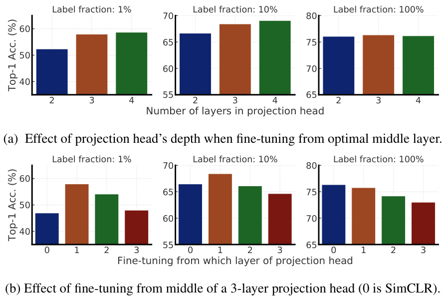 为研究投影头对微调的影响,我们使用SimCLRv2预训练了ResNet-50模型(采用2至4层全连接层作为投影头),并测试了从投影头不同层进行微调时的性能表现。实验发现:(1) 当从投影头最优层进行微调时,预训练阶段使用更深层投影头效果更佳(图5a);(2) 该最优层通常是投影头的首层而非输入层 $\mathrm{[0^{t\bar{h}}}$ ,这一现象在少样本标注数据微调场景中尤为显著(图5b)。