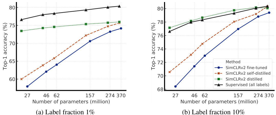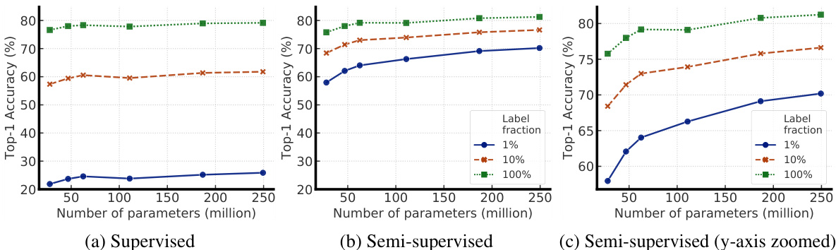 图 4 展示了模型规模和标签比例变化时的性能表现。结果表明,无论是监督学习还是半监督学习,更大的模型都具有更高的标签效率,但半监督学习的收益似乎更大(更多讨论见附录 A)。此外,值得指出的是,虽然更大的模型表现更好,但某些模型(例如采用 SK 的模型)比其他模型(附录 B)具有更高的参数效率,这表明寻找更好的架构是有帮助的。