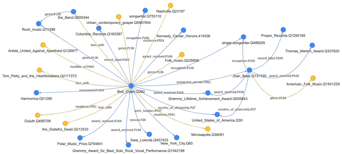 Figure 3: A snapshot subgraph of the open KG generated by MAMA using BERTLARGE from Wikipedia pages neighboring “Bob Dylan”. The blue node and arrow represent the mapped facts in the Wikidata schema, while the yellow node and arrow denote the unmapped facts in the open schema. We also visualize the correct facts that are new in Wikidata in yellow.