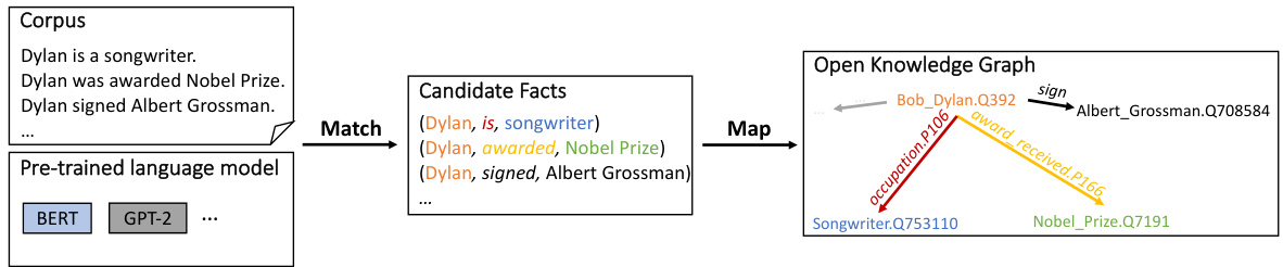 Map produces an open KG using the matched candidate facts from Match stage. The constructed open KG has two portions: (a) mapped candidate facts that are in a fixed KG schema, e.g., (Dylan, is, songwriter) is mapped to (Bob Dylan.Q392, occupation.P106, Songwriter.Q753110) according to Wikidata schema; and (b) unmapped candidate facts that are in an open schema, e.g., a candidate fact (Dylan, signed, Albert Grossman) is partially mapped to (Bob Dylan.Q392, sign, Albert Grossman.Q708584) in the open schema. This stage is described in Sec. 2.2.