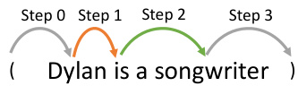 我们设计了一种简单而有效的束搜索(beam search)方法来寻找最佳匹配的候选事实。对于句子中的每个头尾对$(h,t)$,搜索会保留该对的$k$个最佳匹配候选事实。首先考虑从左到右、束宽(beam size)为1的搜索过程。图2展示了一个示例搜索过程:给定头尾对(Dylan, songwriter),在每一步中,搜索会执行以下操作之一: