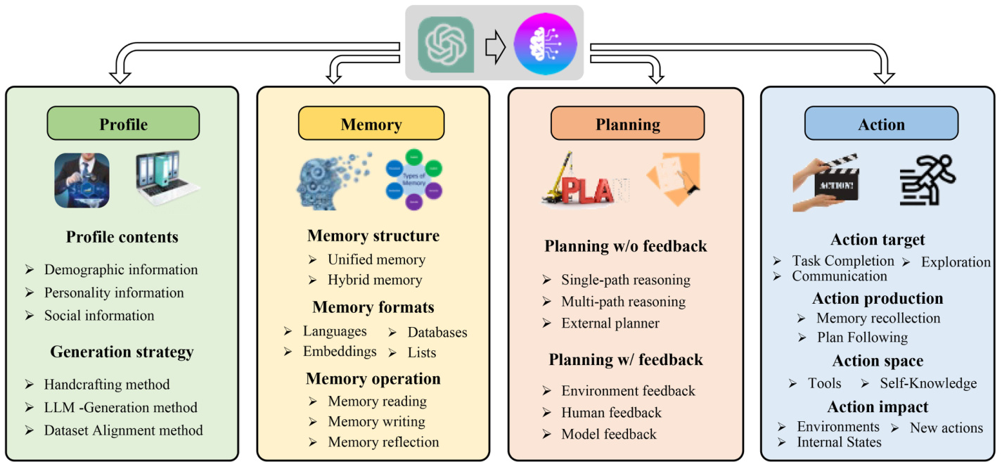 Table 1 For the profile module ①, ② , and ③ to represent the handcrafting method, LLM-generation method, and dataset alignment method, respectively. For the memory module, we focus on the implementation strategies for memory operation and memory structure. For memory operation, we use ① and ② to indicate that the model only has read/write operations and has read/write/reflection operations, respectively. For memory structure, we use ① and ② to represent unified and hybrid memories, respectively. For the planning module, we use ① and ② to represent planning w/o feedback and w/ feedback, respectively. For the action module, we use ① and ② to represent that the model does not use tools and use tools, respectively. For the agent capability acquisition (CA) strategy, we use ① and ② to represent the methods with and without fine-tuning, respectively. “−” indicates that the corresponding content is not explicitly discussed in the paper