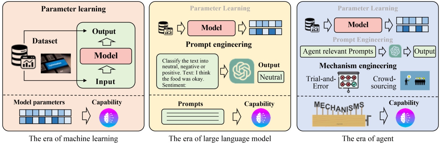 无需微调的能力获取:在传统机器学习时代,模型能力主要通过从数据集中学习获得,知识被编码到模型参数中。在大语言模型时代,模型能力既可以通过训练/微调模型参数获得,也可以通过设计精巧的提示(即提示工程)来获取。在提示工程中,需要将有价值的信息写入提示以增强模型能力或释放现有大语言模型潜力。在智能体时代,模型能力可以通过三种策略获得:(1) 模型微调,(2) 提示工程,以及(3) 设计适当的智能体进化机制(我们称之为机制工程)。机制工程是一个广义概念,涉及开发专用模块、引入新颖工作规则等提升智能体能力的策略。为清晰理解模型能力获取策略的演变,我们在图4中进行了展示。下文将分别介绍用于智能体能力获取的提示工程与机制工程。