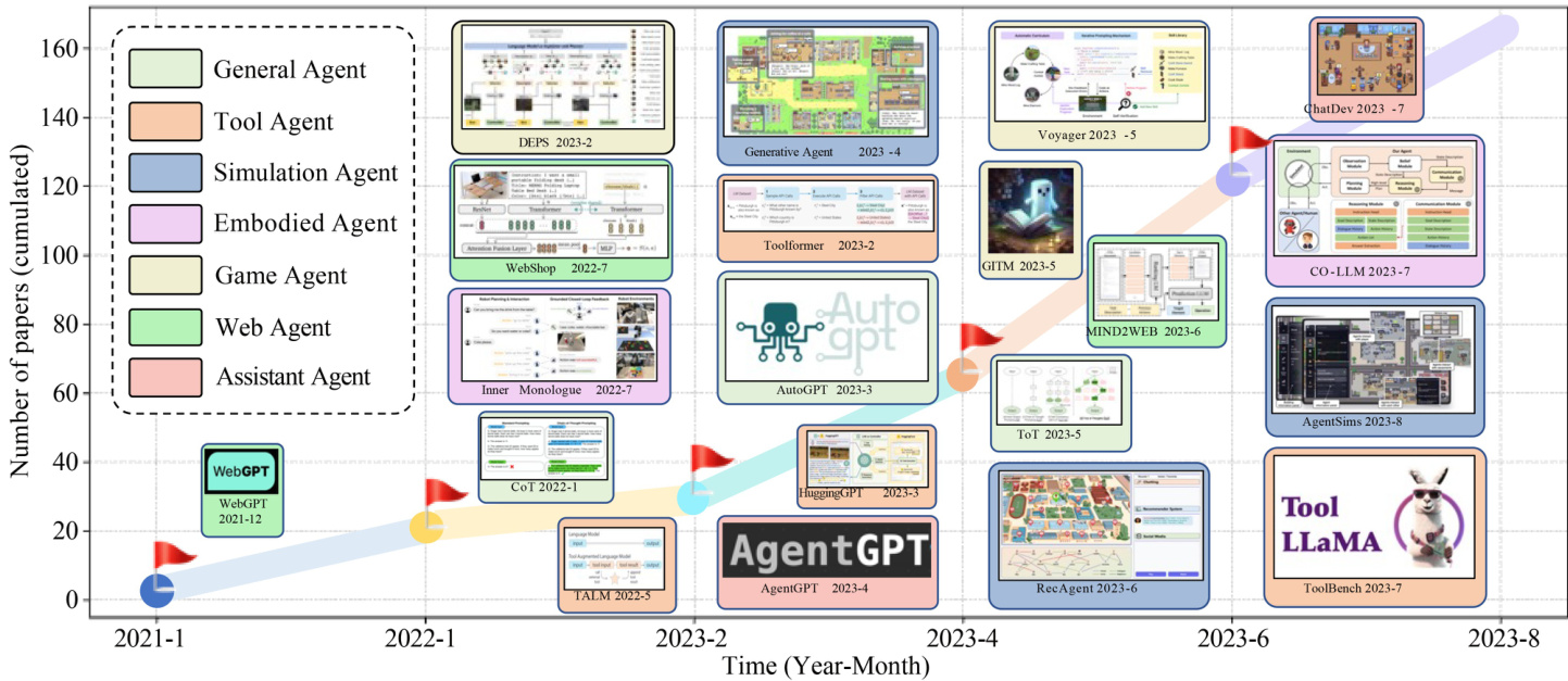 Fig. 1 Illustration of the growth trend in the field of LLM-based autonomous agents. We present the cumulative number of papers published from January 2021 to August 2023. We assign different colors to represent various agent categories. For example, a game agent aims to simulate a game-player, while a tool agent mainly focuses on tool using. For each time period, we provide a curated list of studies with diverse agent categories