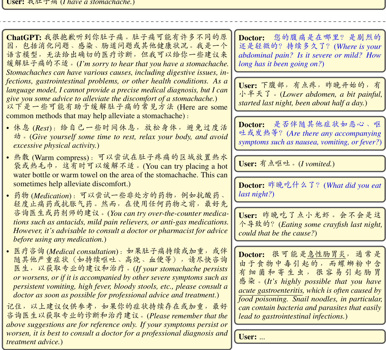 图 1: 医疗咨询对话中ChatGPT回复(左)与医生回复(右)的对比示例(文本已从中文翻译为英文)。医生提出的问题以蓝色标注,医学诊断内容带有下划线。需注意ChatGPT通常不会像医生那样主动向患者提问或提供医学诊断。