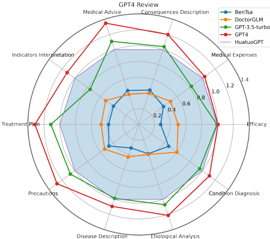 Results For the single-turn questions evaluation, all the model performance results are shown in Table 5. The comparison among models for each category is shown in Figure 3 and the comparison among their overall performance is shown in Figure 4, where the performance of HuatuoGPT is set to 1.0. According to GPT-4, HuatuoGPT is much better than BenTsao and DoctorGPT in all categories. Compared to GPT-3.5-turbo, HuatuoGPT outperforms it in three categories (Indicators Interpretation, Condition Diagnosis, and Medical Expenses) and performs similarly to it in two categories (Efficacy and Disease Description). However, HuatuoGPT is still worse than GPT4 in almost all categories, where it attains similar performance to GPT4 in two categories (Efficacy and Medical Expenses). Overall, HuatuoGPT achieves higher scores than DoctorGLM, BenTsao, and GPT-3.5-turbo. For the multi-turn conversations evaluation, similarly, the overall performance of HuatuoGPT surpasses GPT-3.5-turbo in over $60%$ of cases. The comparison for each category and for overall performance are shown in Table 6, Figure 5, and Figure 6 respectively.