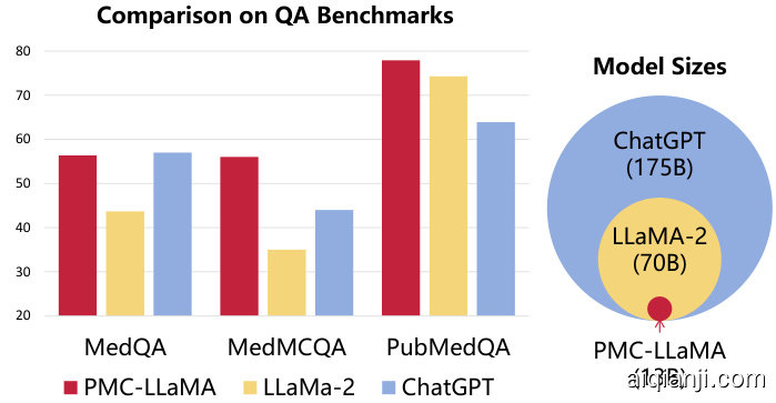 图 1: 左侧展示了我们的PMC-LLaMA与LLaMA-2及ChatGPT的总体对比。右侧直观呈现了我们的模型在参数量级上的优势。PMC-LLaMA明显小于其他模型。