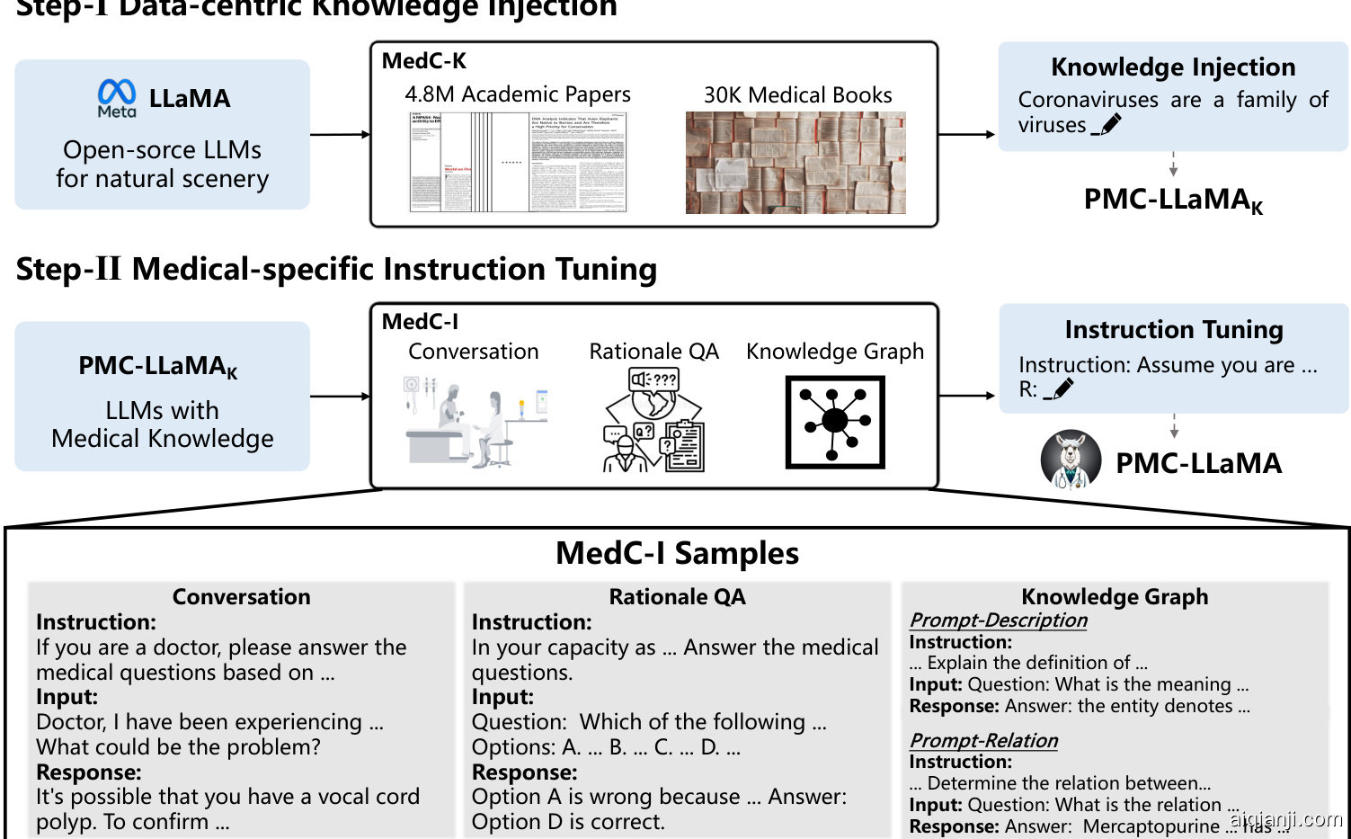 医疗领域专用指令微调。通过整合上述三部分内容,我们构建了一个大规模、高质量的医疗领域专用指令微调数据集MedCI,包含2.02亿token。我们在此基础上对PMC-LLaMA $\mathrm{K}$ 进行微调,最终得到我们的目标模型——PMC-LLaMA。