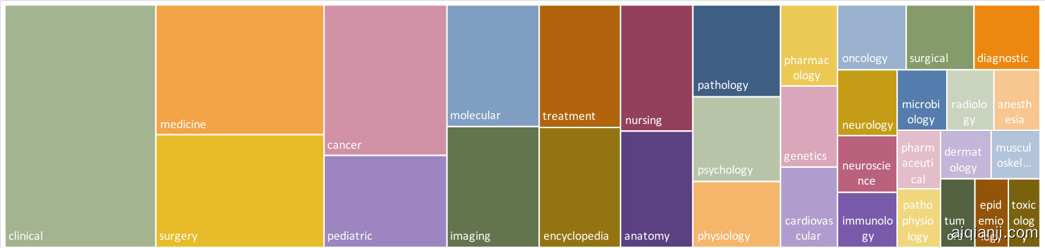 图 3: 医学教材类别分布。箱体大小表示不同类别的书籍数量。