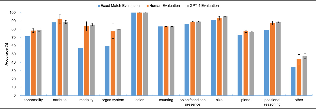 We further analyzed the impacts of different evaluation methods across the pre-defined question types within the VQA-RAD dataset. Figure 3 shows the accuracy under the three distinct evaluation methods and the standard deviations for human and GPT-4 evaluations. The results suggest that accuracy measurements from human and GPT-4 evaluations are closely aligned across different question types, while GPT-4 has a consistently low variability compared to human annotators. A noticeable disparity can be seen between the results of human and GPT-4 evaluation methods and the exact match evaluation, for question types of ’abnormality’, ’modality’, and ’organ system’. Besides, regardless of the evaluation metrics, the model performed relatively well on question types, like ‘color’, ‘attribute’ and ‘size’. Questions associated with ‘abnormality’, ‘plane’ and ‘organ system’ seem to be challenging for our approach.