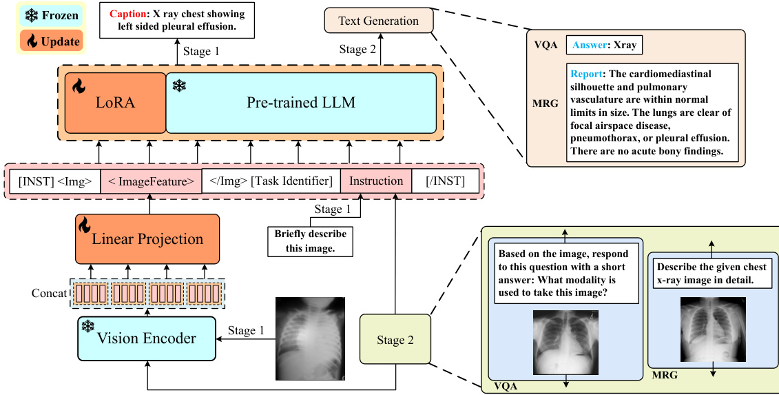 The multimodal prompt incorporates input images, questions and dedicated tokens for downstream tasks. In Figure 1, image features derived from linear projection are denoted as , and the corresponding questions are the text instructions. Special tokens, such as $I V Q A]$ for the Med-VQA task and [report] for the MRG task, serve as task identifiers. This forms the complete multimodal instructional template as:[INST]