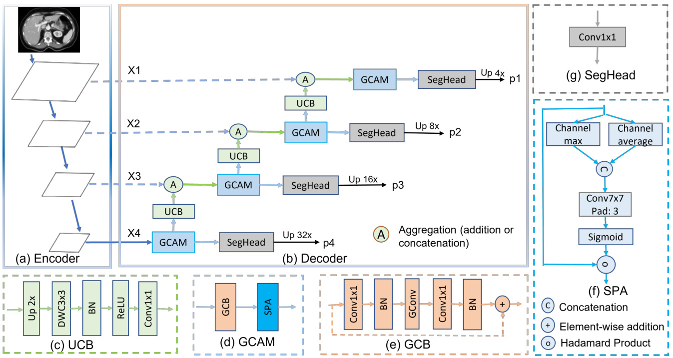 如图 1(b) 所示,G-CASCADE 由高效上卷积块 (UCB) 用于特征上采样、图卷积注意力模块 (GCAM) 用于鲁棒增强特征图,以及分割头 (SegHead) 用于生成分割输出。我们对编码器金字塔特征的四个阶段分别配置了四个 GCAM。为聚合多尺度特征,我们首先将前一解码器块的上采样特征与跳跃连接特征进行聚合 (如相加或拼接)。随后使用 GCAM 处理拼接后的特征以增强语义信息。每个 GCAM 的输出会被送入预测头,最终聚合四个不同预测图以生成最终分割输出。