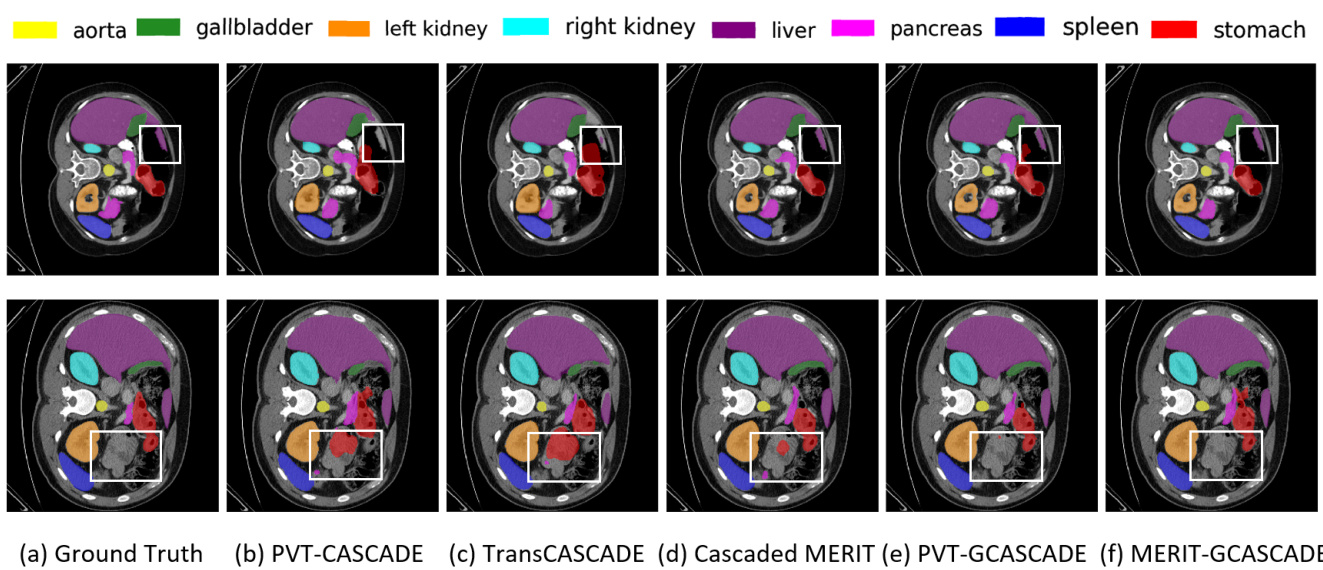 Figure 2. Qualitative results on Synapse multi-organ dataset. (a) Ground Truth (GT), (b) PVT-CASCADE, (c) Trans CASCADE, (d) Cascaded MERIT, (e) PVT-GCASCADE, and (f) MERIT-GCASCADE. We overlay the segmentation maps on top of original image/slice. We use the white bounding box to highlight regions where most of the methods have incorrect predictions.