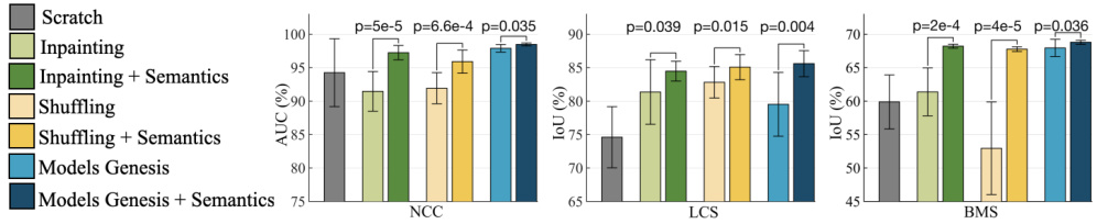 图 2: 在自监督学习方法中,使用和未使用语义增强表示对目标分类和分割任务性能存在显著差异 (p<0.05)。通过引入自发现和自分类机制,我们在三种前沿自监督学习方法 (即图像修复 [19]、块重排 [9] 和 Models Genesis [25]) 中增强了语义表征能力。