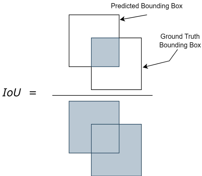 For the evaluation of object detection, a common way to determine if the predicted location of an object was correct is to find in Intersection over Union $(I o U)$ . It is defined as the ratio of the intersection of the predicted and the ground truth bounding box over the union of the predicted and ground truth bounding box. A visual illustration of $I o U$ is presented in Fig. 4. Given the set of predicted bounding boxes $A$ for a given image, and the set of ground truth bounding boxes $B$ for the same image. The IoU can be computed as:
