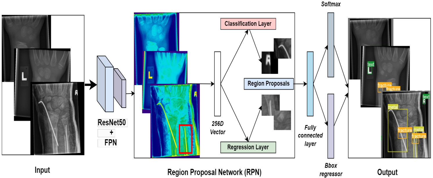 Qi, Zhao, Shi, Zuo, Zhang, Long, Wang and Wang (2020) used a Faster R-CNN model with an anchor-based approach, combined with a multi-resolution Feature Pyramid Network (FPN) and a ResNet50 backbone network. They tested the model on $2333\mathrm{X}$ -ray images of different types of femoral fractures and obtained a mAP score of 0.69.