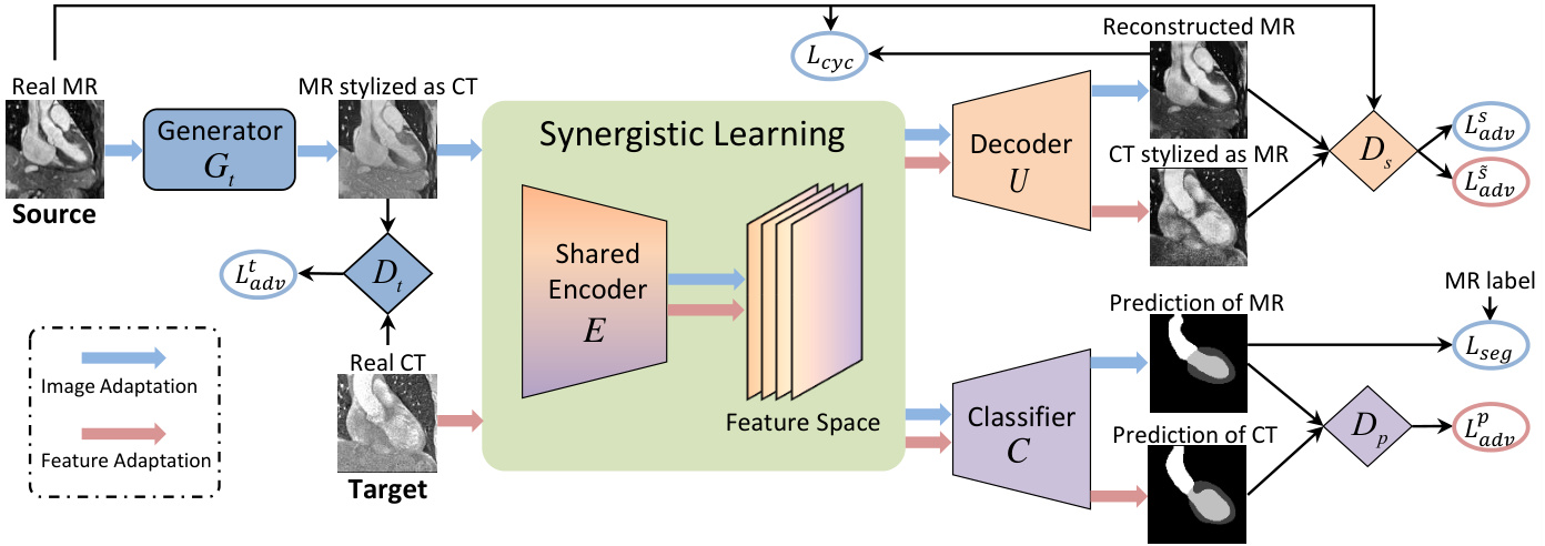 An overview of our proposed method for unsupervised domain adaptation in medical image segmentation is shown in Fig. 2. We propose synergistic image and feature adaptations with a novel learning diagram to effectively narrow the performance gap due to domain shift. The two perspectives of adaptations are seamlessly integrated into a unified model, and hence, both aspects can mutually benefit each other during the end-to-end training procedure.