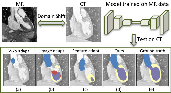 Figure 1: Illustration of addressing the severe cross-modality domain shift of medical images from different perspectives. The segmentation results of the CT images with the DCNN trained on MR data are shown in the bottom: a) without any adaptation; b) with pure image adaptation; c) with pure feature adaptation; d) our proposed synergistic image and feature adaptations; e) the ground truth.