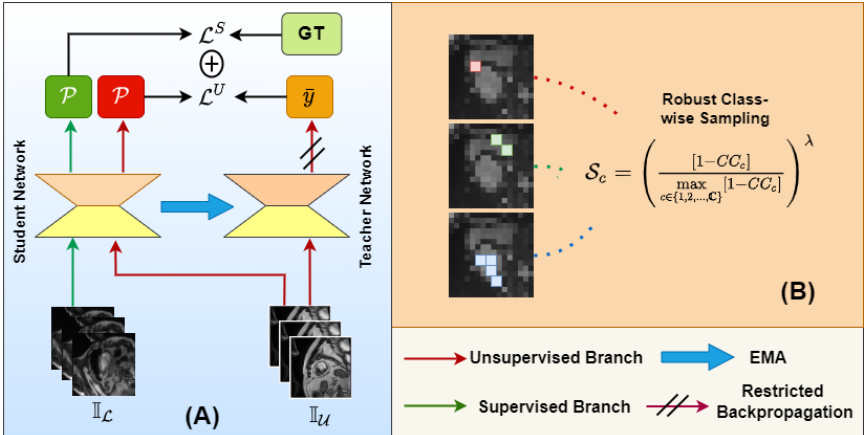 图 1: 所提出方法的整体训练策略: (A) 基础学生-教师网络, 作为本工作的主干框架, (B) 鲁棒类别采样机制, 自适应地从表现欠佳的类别中采样更多像素