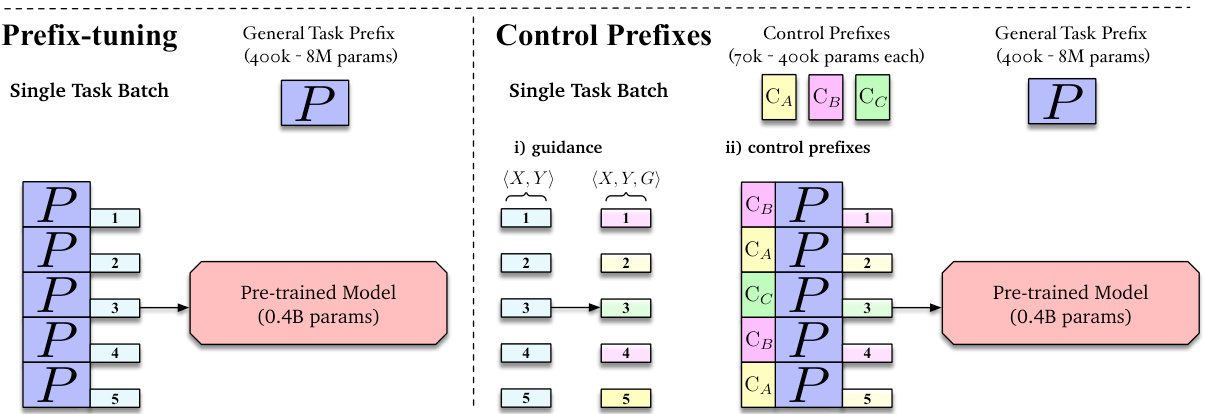 使用一个能捕捉广泛自然语言理解的固定PLM (预训练语言模型)为模型提供了参数高效的起点,该起点可被多种不同任务共享。将其与可训练的任务表征相结合,使得模型能够学习与特定任务相关的信息。此外,引入属性级参数使我们能够引导生成朝向所需方向,并为模型提供数据点级别的信息。通用的任务特定参数本身可以适应模块化控制前缀,这些前缀会根据每个输入$X$的引导信号而变化。这种参数划分使得细粒度控制得以扩展,从而提升下游任务性能。因此,控制前缀 (CONTROL PREFIXES) 能够在保持固定语言模型、参数高效方法的同时,利用输入级别的信息。本研究中,我们仅考虑将离散标签作为引导信号的属性。